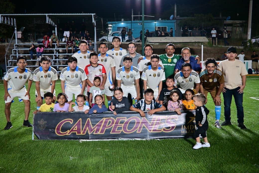 Mazatlán, Sinaloa a 27 de marzo de 2026.- La Liga de Futbol 7, realizada con el apoyo del Gobierno de Mazatlán que encabeza la Presidenta Municipal, Estrella Palacios Domínguez, en la cancha de la Unidad Deportiva Lomas del Ébano, definió a su campeón con el triunfo en la final de Florería Gary 9-4 sobre el equipo Borrachos.