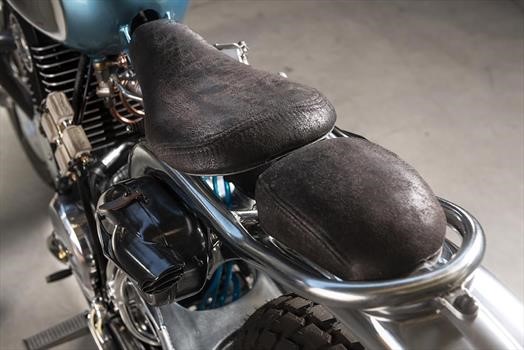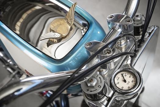 El tanque de gasolina, de otra moto Bianchi, también se recortó para que cupiera sobre el motor y es básicamente el único toque de color en la moto. La pintura es una “poción” a base de tinta hecha a la medida que luego se llamó “azul de caramelo lamido”.
