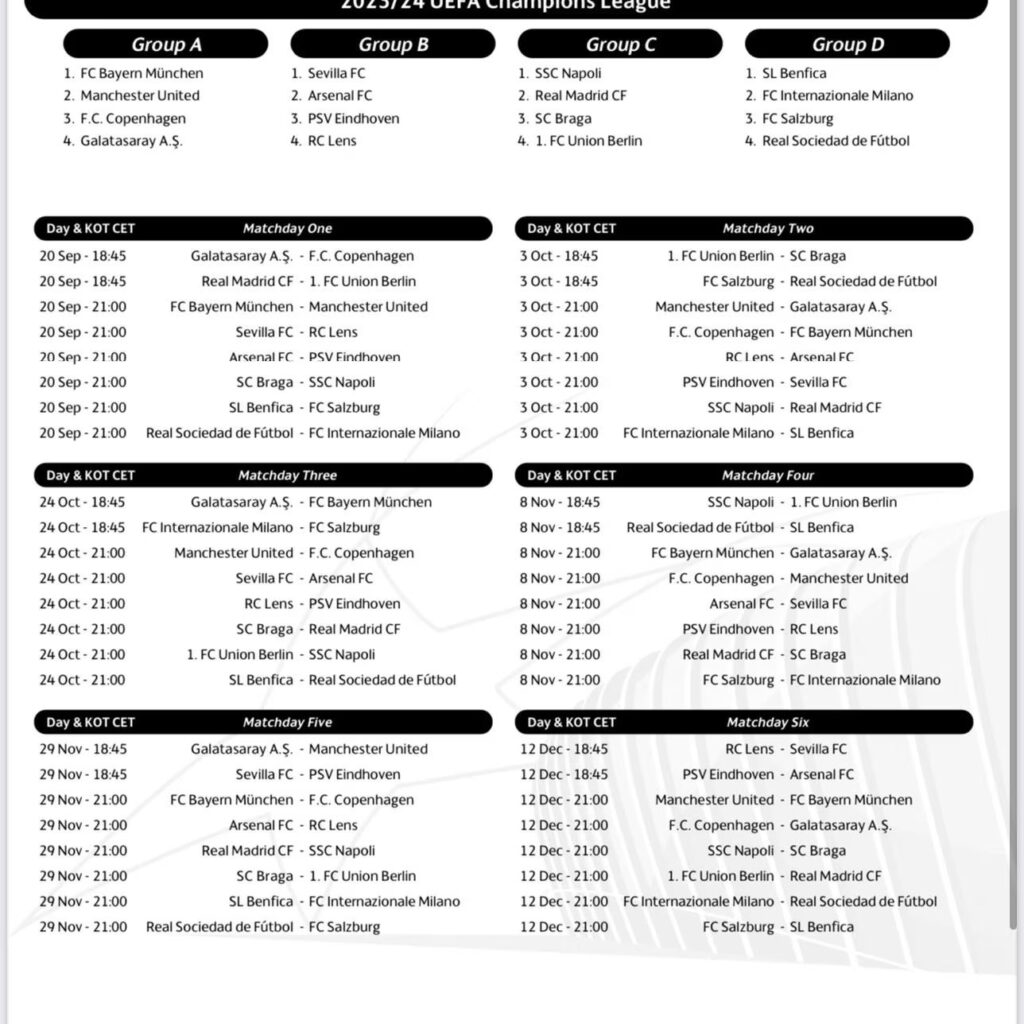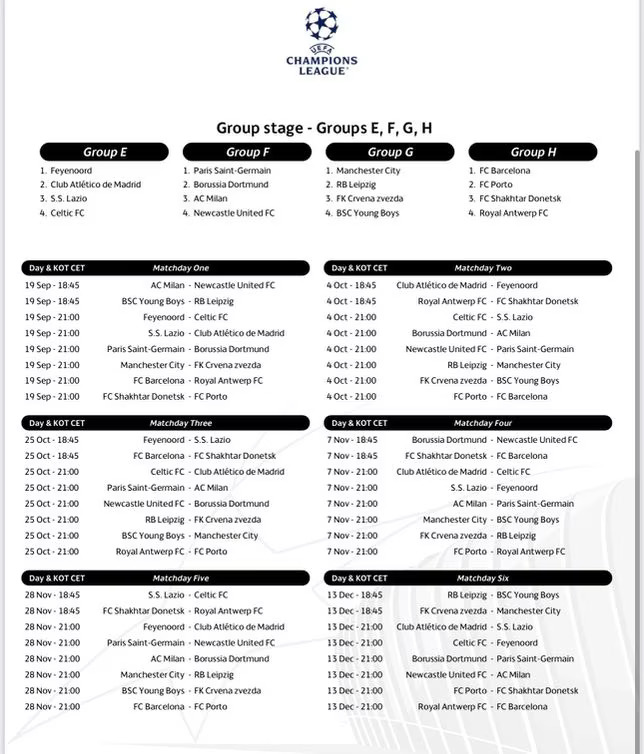 Tras el sorteo de la fase de grupos de la Liga de Campeones de la UEFA (temporada 2023-24) celebrado el viernes en Mónaco, el organismo rector del fútbol europeo ha confirmado las fechas y los horarios de los partidos de las seis jornadas.