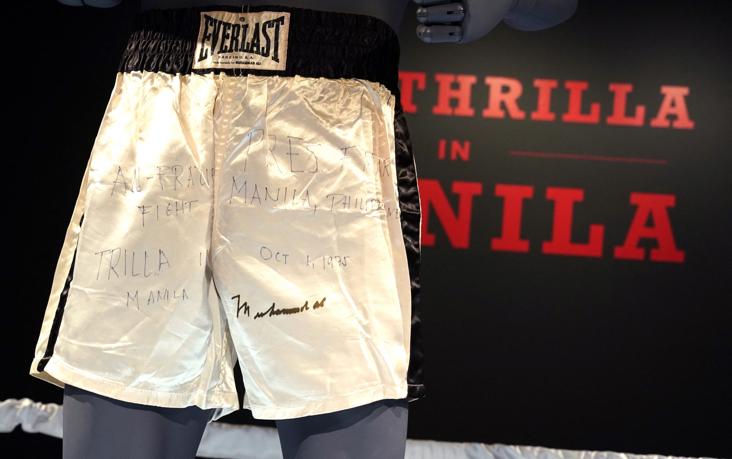 Los baúles de satén blanco de Muhammad Ali de su épico combate “Thrilla in Manila” contra su rival Joe Frazier salieron a subasta el jueves y se espera que se vendan por más de 6 millones de dólares.