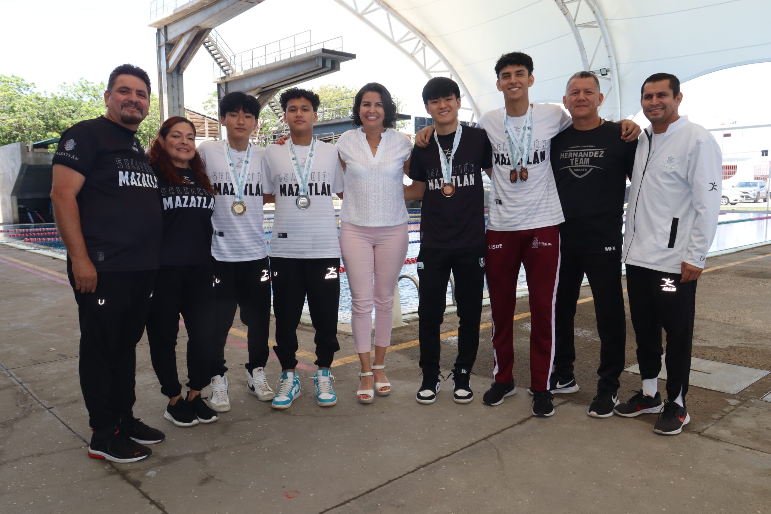 Los jóvenes karatecas compartieron la emoción de sus triunfos con la directora del Instituto Municipal del Deporte de Mazatlán, Fabiola Judith Verde Rosas, acompañados de los entrenadores Jesús Moreno Salas, Alma Rosa Bautista, Gerardo Alexis García Hernández, así como Luis Hernández Lizárraga.