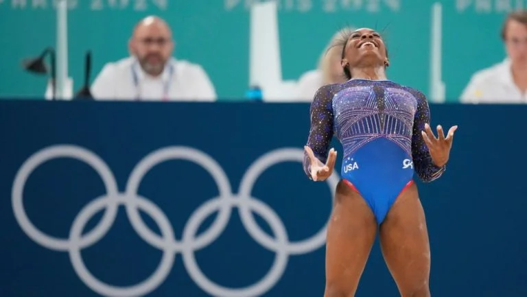 La estrella estadunidense superó el jueves a la brasileña Rebeca Andrade durante una tensa final del concurso completo individual.